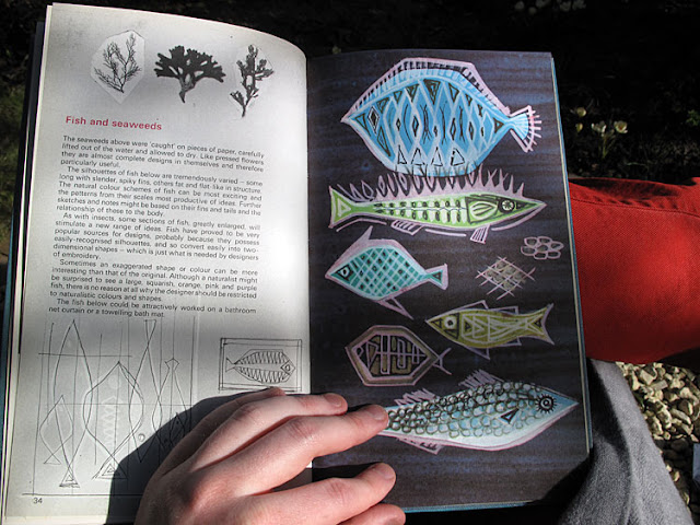 I had my first read in the spring sunshine this week. The book I chose was Pat Score's Let's start designing which is another charity shop find. As you can see from the lovely illustrations she gives advice as how to design some funky embroidered works. Sadly I am neither very talented with needle nor thread but I appreciate her illustrations.